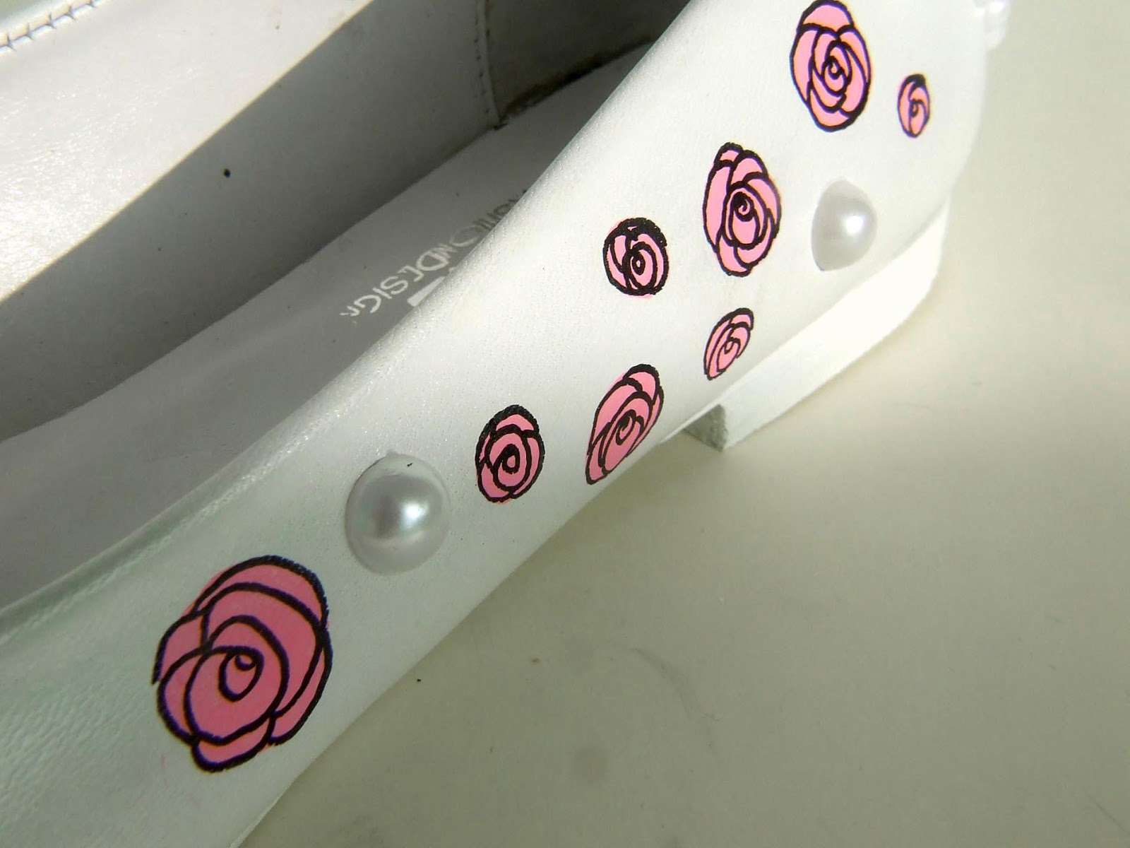 On one shoe, bride and groom are painted driving in a pink wedding car again.On the other classic proposal scene is used.