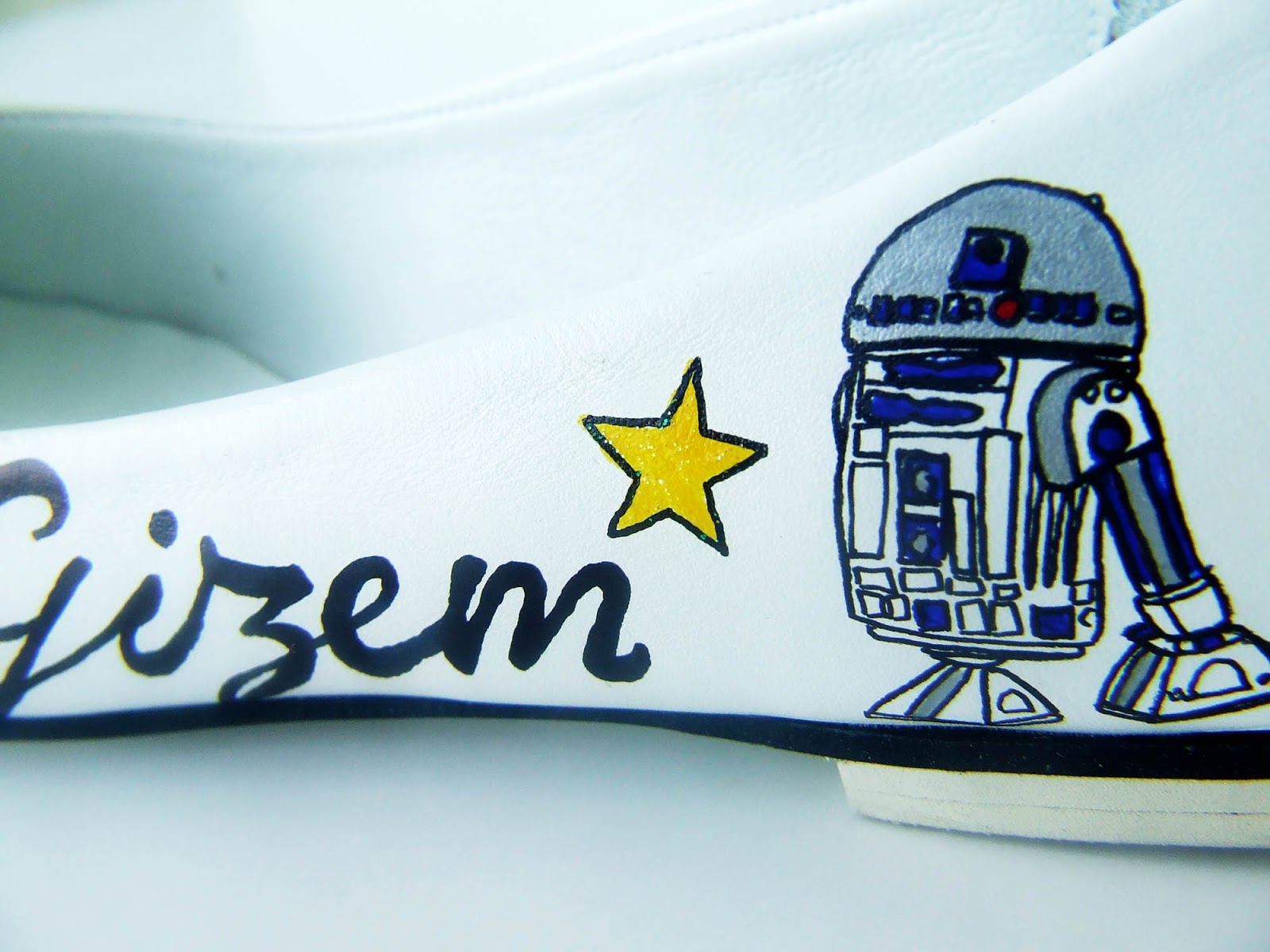 I painted Yoda on one shoe and R2D2 on the other. Their names are written on outer sides, with a couple of shiny yellow stars around.Bir ayakkabıya Yoda'yı, diğerine de R2D2'yi boyadım. Adları da dış yanlara yazıldı, birkaç ışıltılı sarı yıldız eklendi.